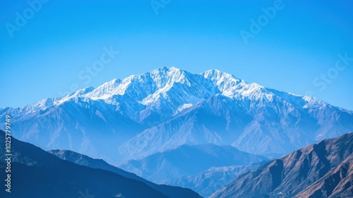 © logyartstudios, Obraz premium A majestic snow-capped mountain peak rises against a clear blue sky.