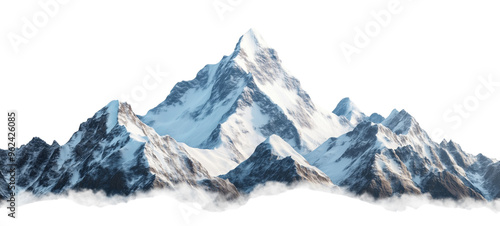 © Jennifer Clason, Obraz premium A majestic, snow-capped mountain range with sharp, rugged peaks under a clear sky against an isolated, transparent background
