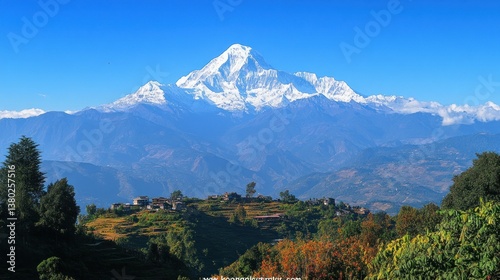 © lestari, Fototapeta premium A majestic snow capped mountain rises above a rural village