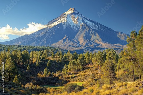 Fototapeta premium A majestic snow-capped volcano surrounded by lush greenery and pine trees...