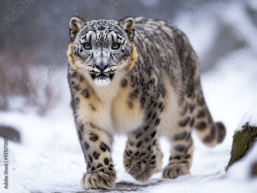 Obraz premium A majestic snow leopard prowls through a snowy landscape, showcasing its...