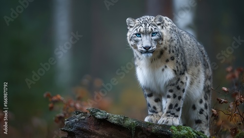© ifa, Fototapeta premium A majestic snow leopard stands alert on a weathered log, its striking blue eyes captivating the viewer in a misty forest setting.