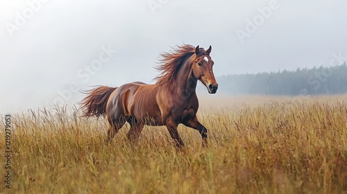 Obraz premium A majestic stallion galloping through a field of tall grass, with its mane...