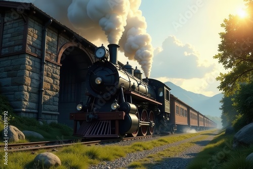 © Mali, Obraz premium A Majestic Steam Locomotive Exits a Stone Tunnel, Embarking on a Scenic Journey Through Verdant Hills Under a Golden Sunset