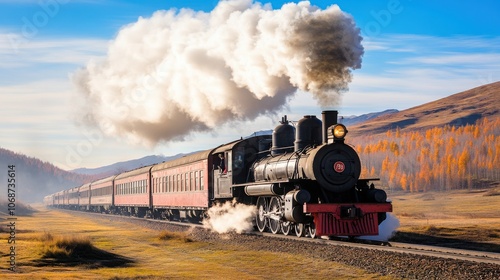 © Preeyanuch, Obraz premium A majestic steam train travels through a picturesque landscape, surrounded by mountains and vibrant autumn colors.