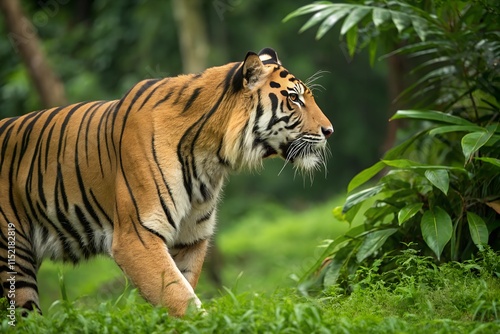 Fototapeta premium A majestic Sumatran tiger prowls stealthily through dense jungle, its striped...