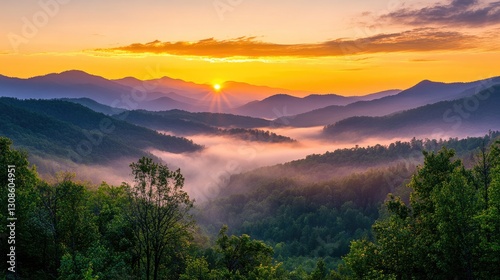© samrit, Obraz premium A majestic sunrise view of a mountain landscape, with golden light brightening the peaks and mist drifting gently through the valleys