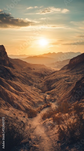 © Olsek, Fototapeta premium A majestic sunset unfolds over rugged mountain landscapes. Soft rays illuminate the serene valley. Nature reveals its stunning beauty every day. Generative AI