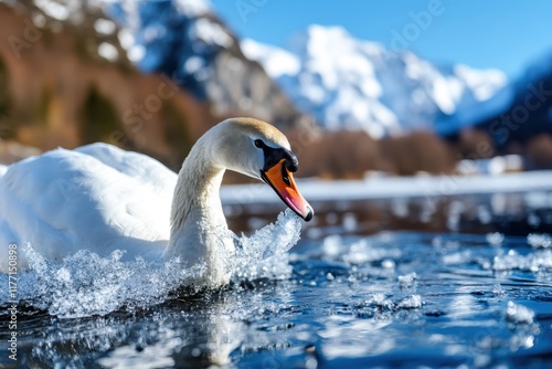 Fototapeta premium A majestic swan gliding gracefully across the water with snow-capped mountains in the background, evoking a sense of serenity and beauty in nature's landscape.