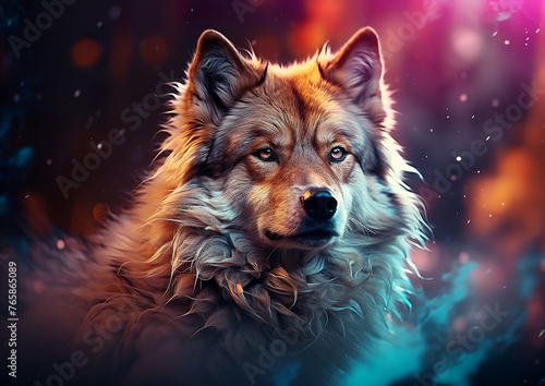© Czintos Ödön, Naklejka premium A majestic, thick-coated wolf-dog stares intently at a vibrant background mixing warm and cool tones. Soft lighting highlights his features, giving off a gentle glow.AI generated.