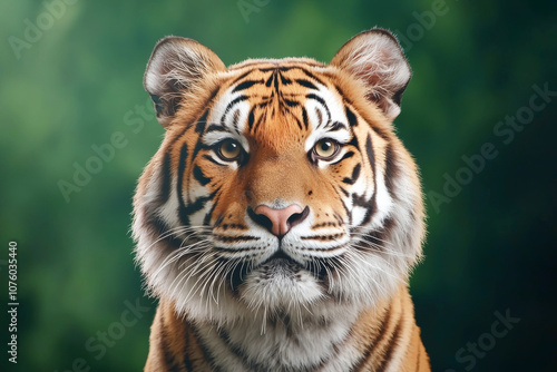 Naklejka premium A majestic tiger gazes intensely amidst a lush green background, showcasing...