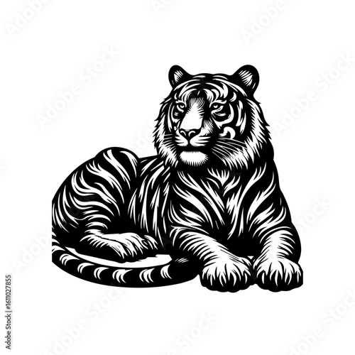 Fototapeta premium A majestic tiger lies in repose, isolated on white
