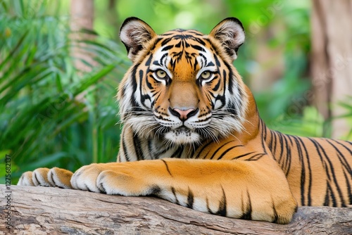 © DenisNata, Obraz premium A majestic tiger resting on a log in a lush green environment.