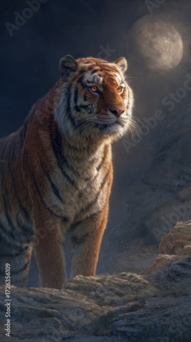 Naklejka premium A majestic tiger stands alert against a backdrop of moonlit rocks, its gaze...