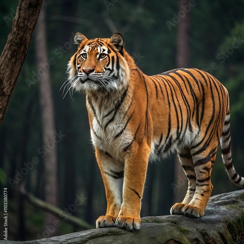 © Pixels, Naklejka premium A majestic tiger stands on a rock, blending into the vibrant forest backdrop.