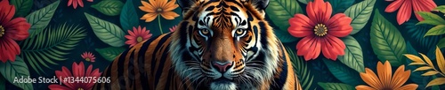 © Pawarit, Fototapeta premium A majestic tiger surrounded by vibrant flowers and lush greenery.