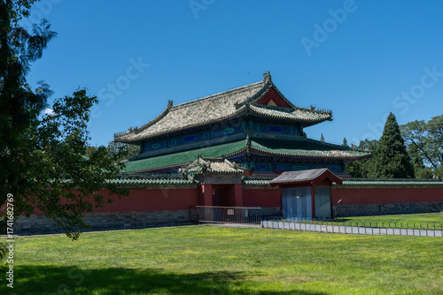 Obraz premium A majestic traditional Chinese temple or hall with an intricate green tiled roof and a perimeter red wall. The historic structure is set against a blue sky and green lawn, conveying culture