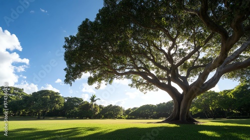 Fototapeta premium A majestic tree stands tall in a lush green park under a clear blue sky,...