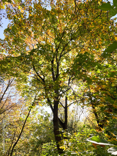 Naklejka premium A Majestic Tree with Brilliant Autumn Leaves Standing Tall in a Sunlit Forest Setting