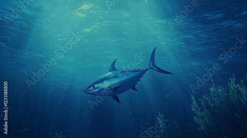 © ANRI, Naklejka premium A majestic tuna fish swimming swiftly through the deep blue ocean, photorealistic marine scene