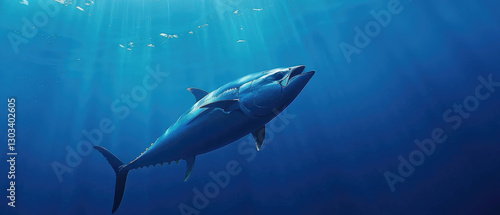 Fototapeta premium A majestic tuna swims gracefully through the deep blue ocean, illuminated by sunlight filtering through the water's surface.