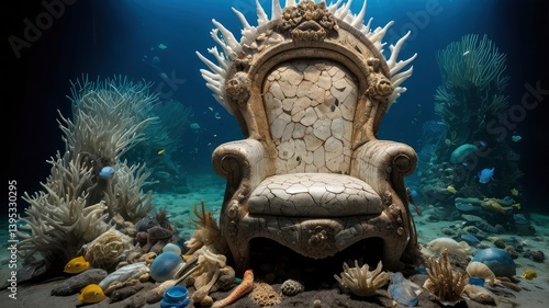 Fototapeta premium A majestic underwater throne made of coral and seashells, surrounded by...
