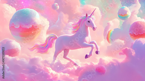 Fototapeta premium A majestic unicorn gallops through a dreamscape of cotton candy clouds and floating orb-like planets.