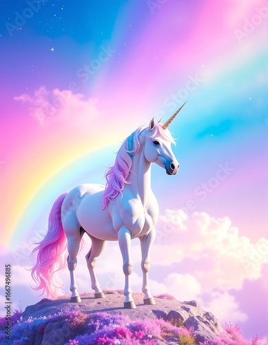 Fototapeta premium A majestic unicorn perched atop a rugged rock formation.