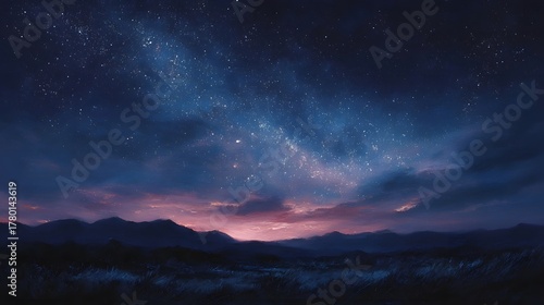 © Bussakon, Obraz premium A majestic view of the Milky Way galaxy arching over a serene mountain landscape at twilight