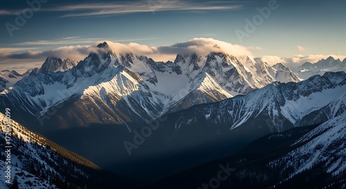 Fototapeta premium A majestic vista of snow-capped peaks bathed in the soft light of a tranquil...