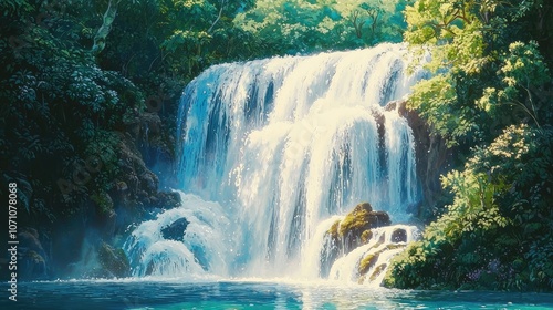 Fototapeta premium A majestic waterfall cascades down moss-covered rocks into a tranquil pool of...