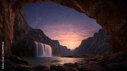 Obraz premium A majestic waterfall cascades into a serene pool within a rocky canyon under a twilight sky dotted with stars