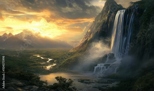 Fototapeta premium A majestic waterfall cascading down a mountain, with mist rising and sunlight...