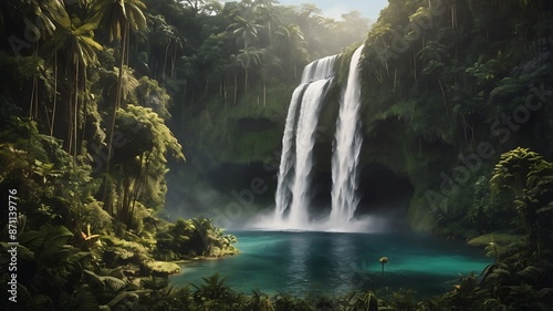 © Ruslan Abdullin, Fototapeta premium A majestic waterfall flowing into a tranquil pool, encircled by verdant foliage.