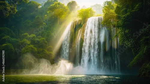 Obraz premium A majestic waterfall in the middle of a dense, green forest, with rays of sunlight breaking through the canopy and mist rising from the water
