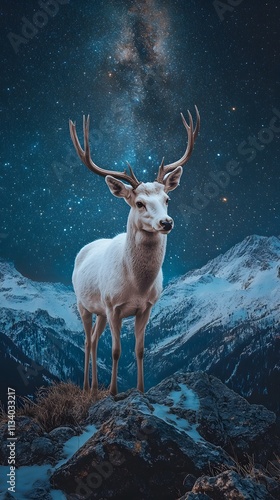 © Gendar SINURO, Fototapeta premium A majestic white deer with perfect antlers, on the mountain and the view of the stars in the beautiful sky