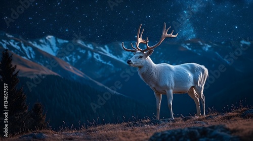© Gendar SINURO, Fototapeta premium A majestic white deer with perfect antlers, on the mountain and the view of the stars in the beautiful sky