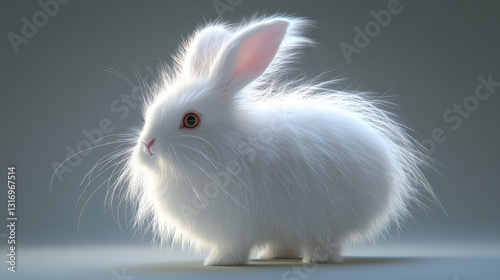 © otter2, Obraz premium A majestic white rabbit with long silky fur, standing still against a simple light gray background