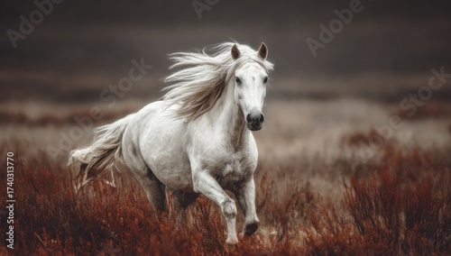 © rohmat, Obraz premium A majestic white steed gallops through tall, brown grasses, wind flowing through its mane