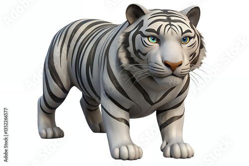 © Animal Photo, Naklejka premium A majestic white tiger, powerfully poised, gazes intently, showcasing striking black stripes against its pristine coat on a stark white background.