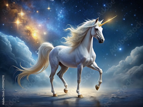Fototapeta premium A Majestic White Unicorn with a Golden Horn Standing Among Stars, Silhouette...