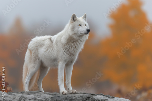 Obraz premium A majestic white wolf, a mix of dog and wild coyote, stands proudly on a...