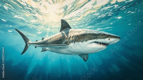 Fototapeta premium A majestic whitetip shark glides serenely just below the water's surface, its...