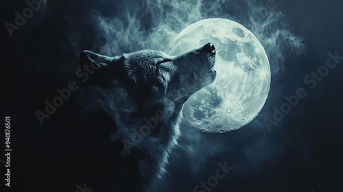 © Jiraporn, Obraz premium A majestic wolf howling at a bright full moon, surrounded by mist and darkness, capturing the essence of nature's wild beauty.