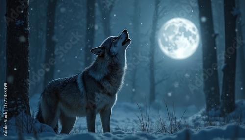 © Viktor, Naklejka premium A majestic wolf howls at full moon in snowy forest. Winter night scene with animal in nature. Wild wolf portrait on cold landscape. Lonely wolf creature under moonlight.