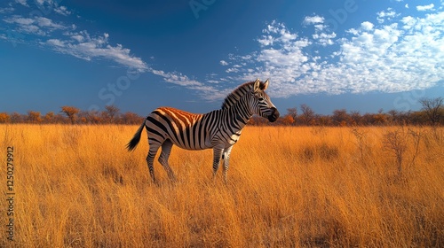 Naklejka premium A majestic zebra standing in a golden savannah under a vibrant blue sky with scattered clouds