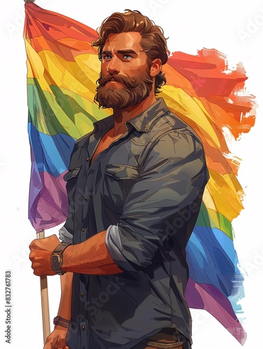 Fototapeta premium A male character portrait and a confident expression, holding a rainbow flag,...