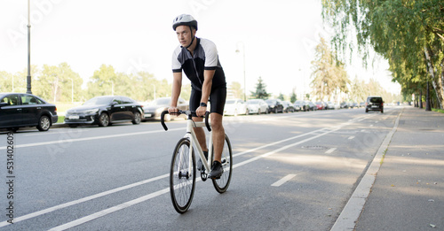 © muse studio, Obraz premium A male cyclist in a helmet rides a bicycle, training in the city.