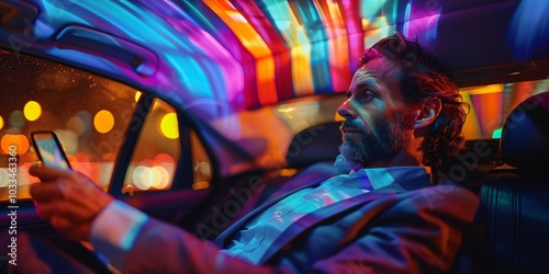 © guolin, Obraz premium A male executive in a taxi at night, using his smartphone while commuting, representing the busy lifestyle of a businessman. This image captures the blend of technology and urban life in the corporate