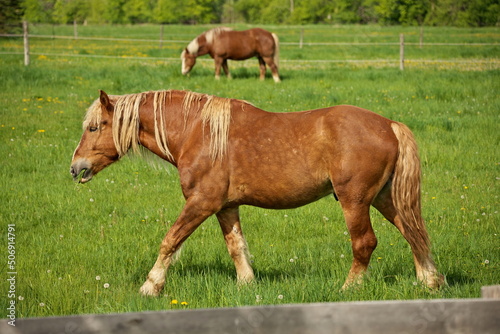 © Mark van Dam, Fototapeta premium A Male Flaxen Chestnut Horse Stallion Colt Walking Through a Pasture Meadow between grazing